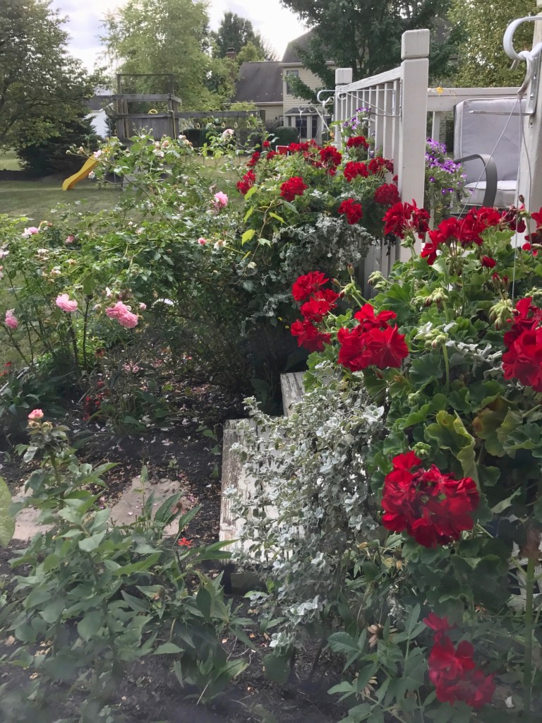 The DeLuca’s garden underwent partial redesign this year with the conversion of one large bed from part sun to full sun. It now has a mix of foundation plants (Japanese maples, dwarf junipers) and roses. Besides climbers, minis, grandifloras and a few tea roses, they have a large number of shade plants, including hostas.